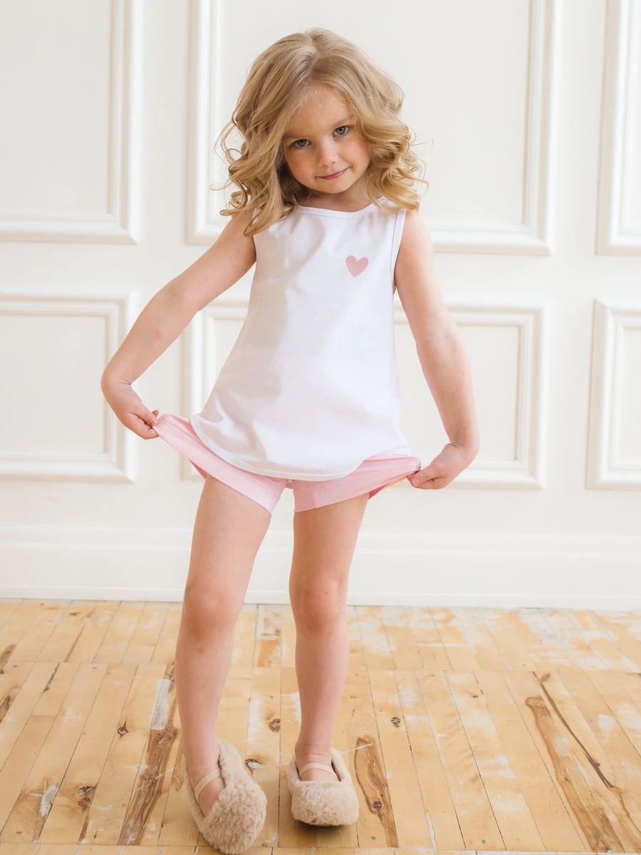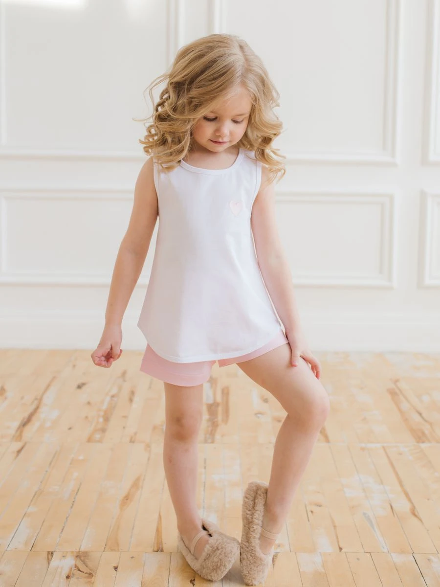 Майка для девочки Little Rose Heart — аккуратная белая база с нежным акцентом: вышивкой розового сердца. Идеальный вариант на каждый день, в детский сад, школу, прогулки и летние образы. Легко сочетается с юбками, шортами, джинсами и спортивными комплектами.