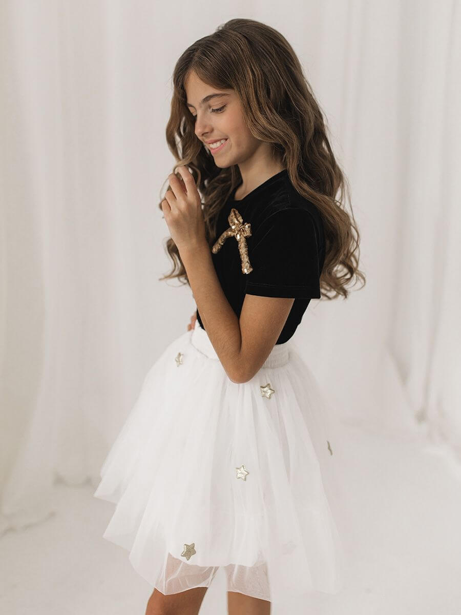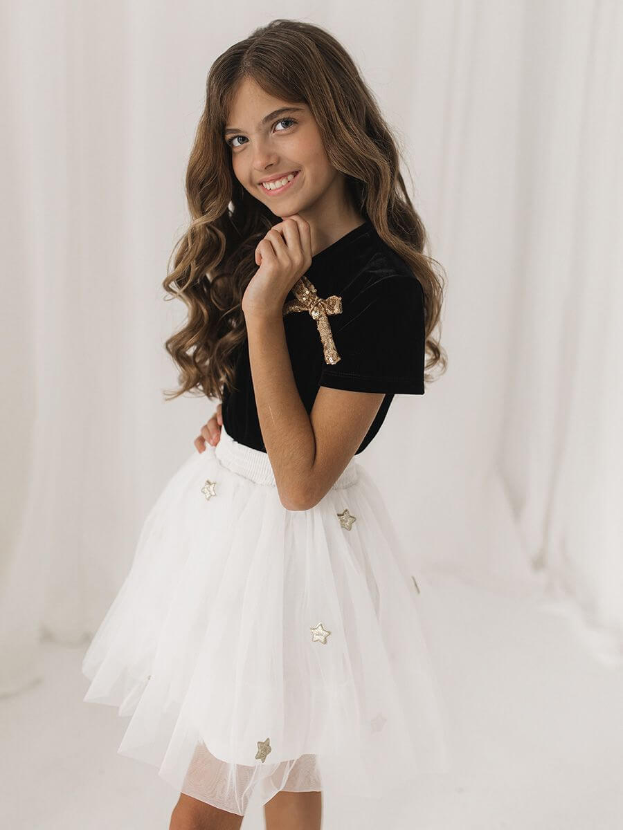 Модная юбка «White Stars» от российского бренда «Радужный Хлопок»: комфорт и стиль для каждой девочки! Изготовлена из мягкого материала – кулира и еврофатина (95% хлопка и 5% эластана). Подходит для любого сезона благодаря универсальной плотности ткани. Подойдет девочкам размером от 104 до 152 см.