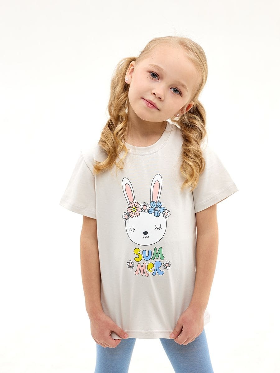 Футболка от бренда Радужный Хлопок! Изготовлена из качественного материала - кулира с добавлением лайкры для комфортной посадки. Однотонный дизайн с принтом зайчика подойдет как для повседневного ношения, так и для особых случаев. Подходит девочкам от 3 до 10 лет, размеры доступны от 98 до 140 см.