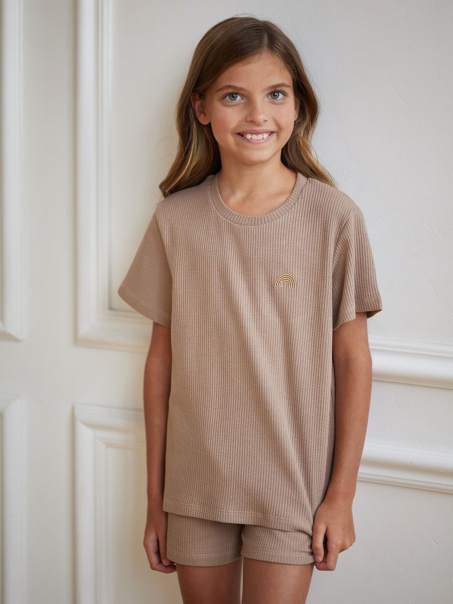 Комплект для девочки Beige Waffle от Радужного Хлопка изготовлен из натурального хлопка вафельной текстуры, что обеспечивает комфорт и удобство. Однотонный бежевый цвет подойдет на любой сезон, а вышитый узор добавляет индивидуальности. Размеры от 104 до 152 см гарантируют подходящий вариант для возраста от 4 до 12 лет.