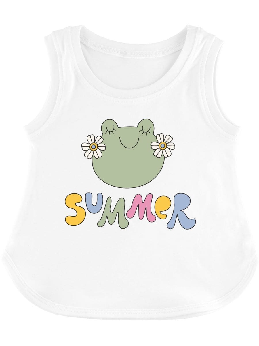 Белая майка декорированная рисунком и надписью «Summer», выполненными по технологии «шелкография». Классическая модель с усиленным воротом и широкими бретельками позволяет свободно двигаться.