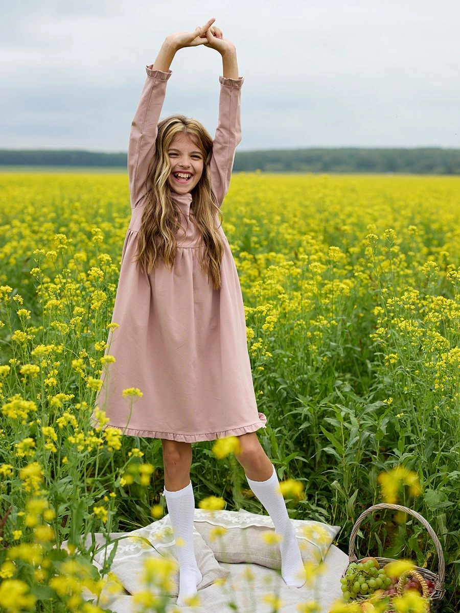 Rose Charm — нежное повседневное платье для девочки в оттенке «пудра». Мягкий хлопковый трикотаж приятен к телу и подходит для активного дня: садик, прогулки, гости и семейные фото.