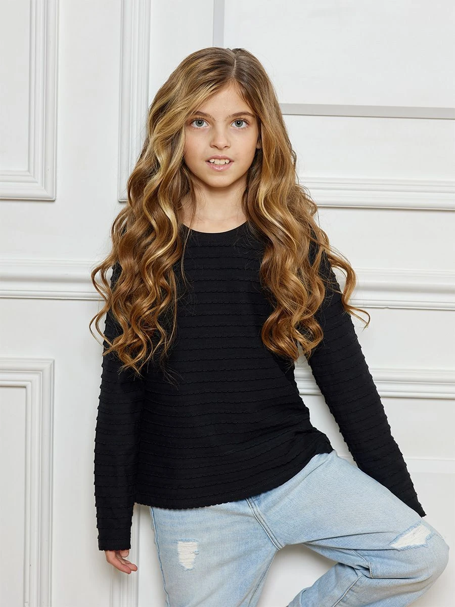 Черный лонгслив для девочки Black Ruffles от бренда «Радужный Хлопок» — мягкий дышащий рубчик с лёгким эффектом гофре для осени-зимы и демисезона.