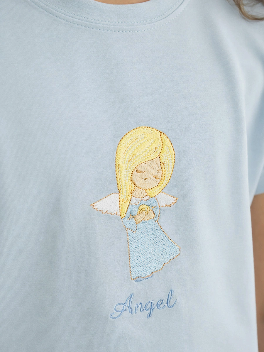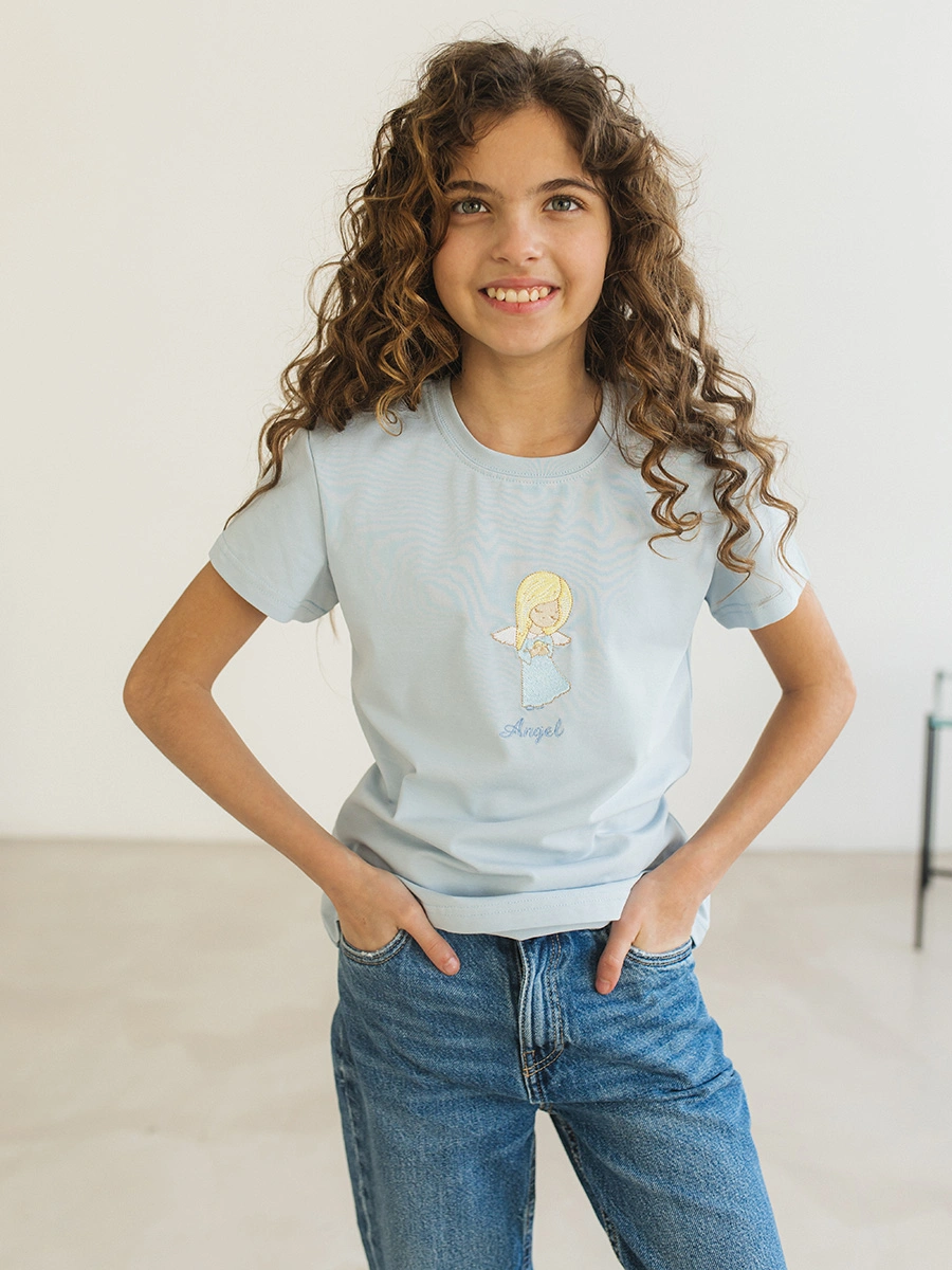 ">Элегантную футболку "Blue Angel" украшает изящная вышивка ангела, добавляющая образу лёгкости и волшебства. Эта очаровательная деталь делает вещь ещё более привлекательной и запоминающейся. Мягкий материал позволяет коже дышать, поддерживая комфорт даже при активном времяпровождении. Девочки будут счастливы носить эту стильную и практичную одежду, которая станет любимым элементом их гардероба.