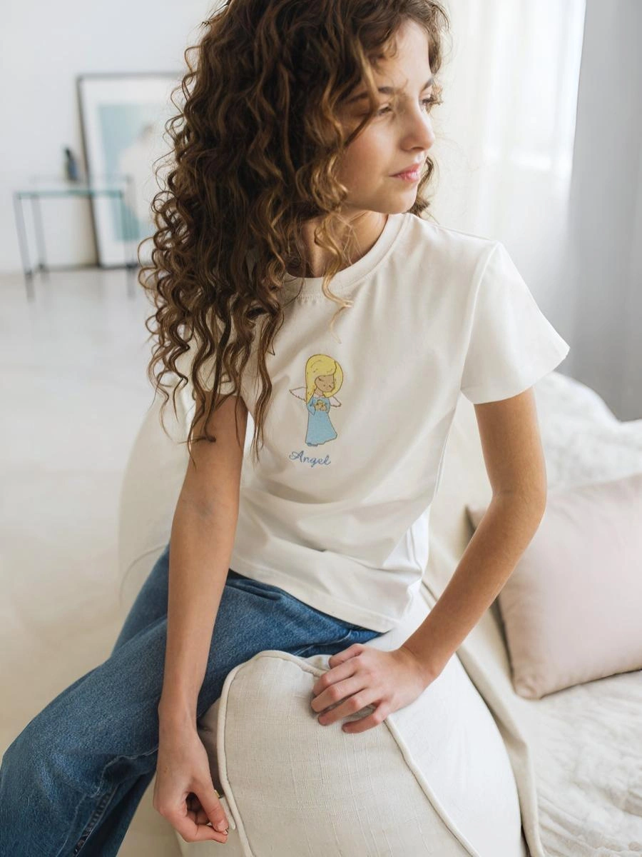 ">Эта очаровательная футболка украшена нежной вышивкой "ангел", добавляющей образу особую трогательность и милоту. Подарите своей малышке удобство, стиль и радость с каждой ноской! Подойдет для прогулок, игр и повседневной жизни. Станет прекрасным подарком и любимым элементом детского гардероба.
