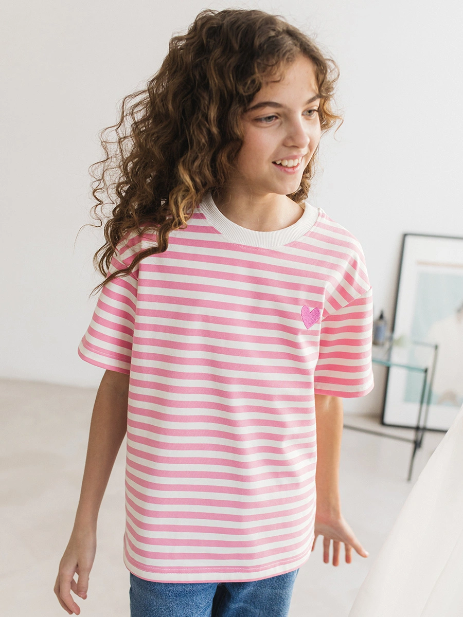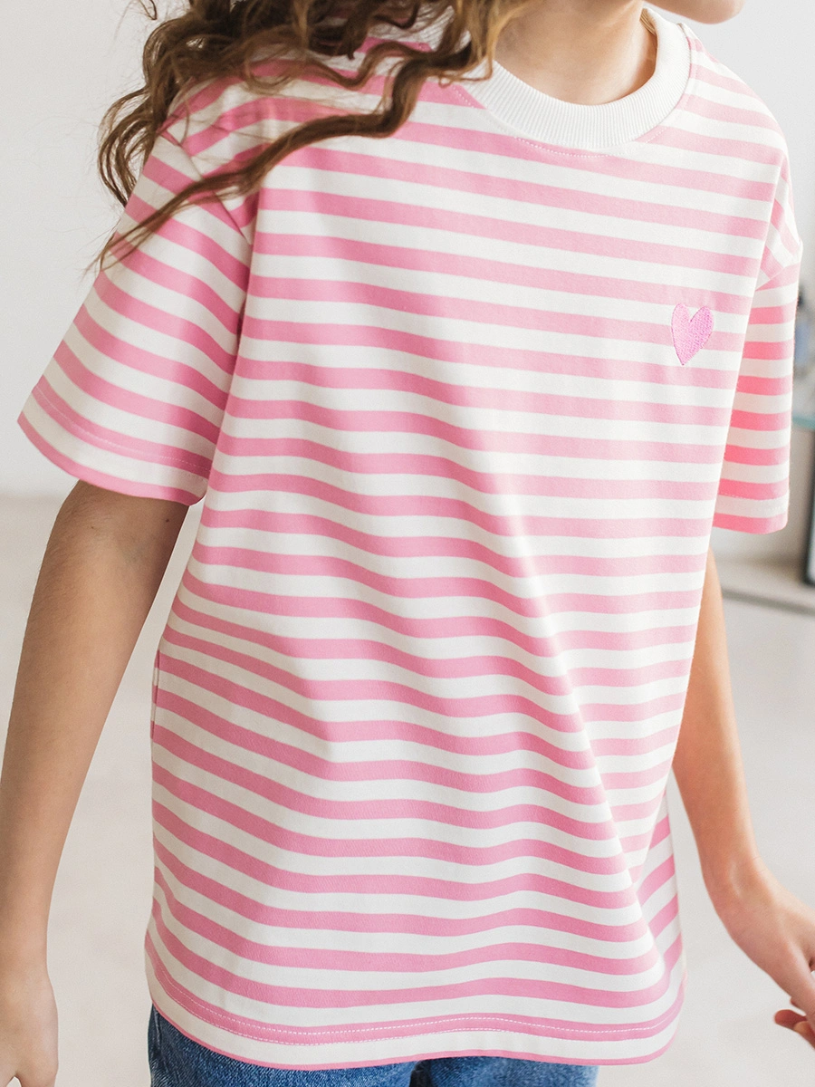 Футболка для девочки в розовую полоску Pink Stripe Heart от Радужного Хлопка — летняя модель на каждый день из премиум трикотажа: 95% хлопок, 5% лайкра.
