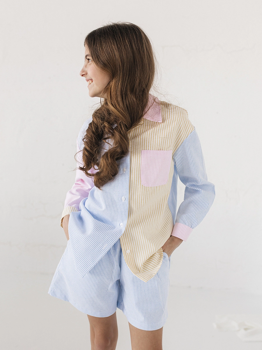 Blue Coast — лёгкие летние шорты в нежной голубой полоске для активных прогулок, поездок и отдыха у воды. Модель выглядит аккуратно и при этом не сковывает движения: удобно бегать, кататься на велосипеде и играть на площадке. Благодаря спокойному рисунку полоски шорты легко сочетаются с однотонными футболками, рубашками и топами.
