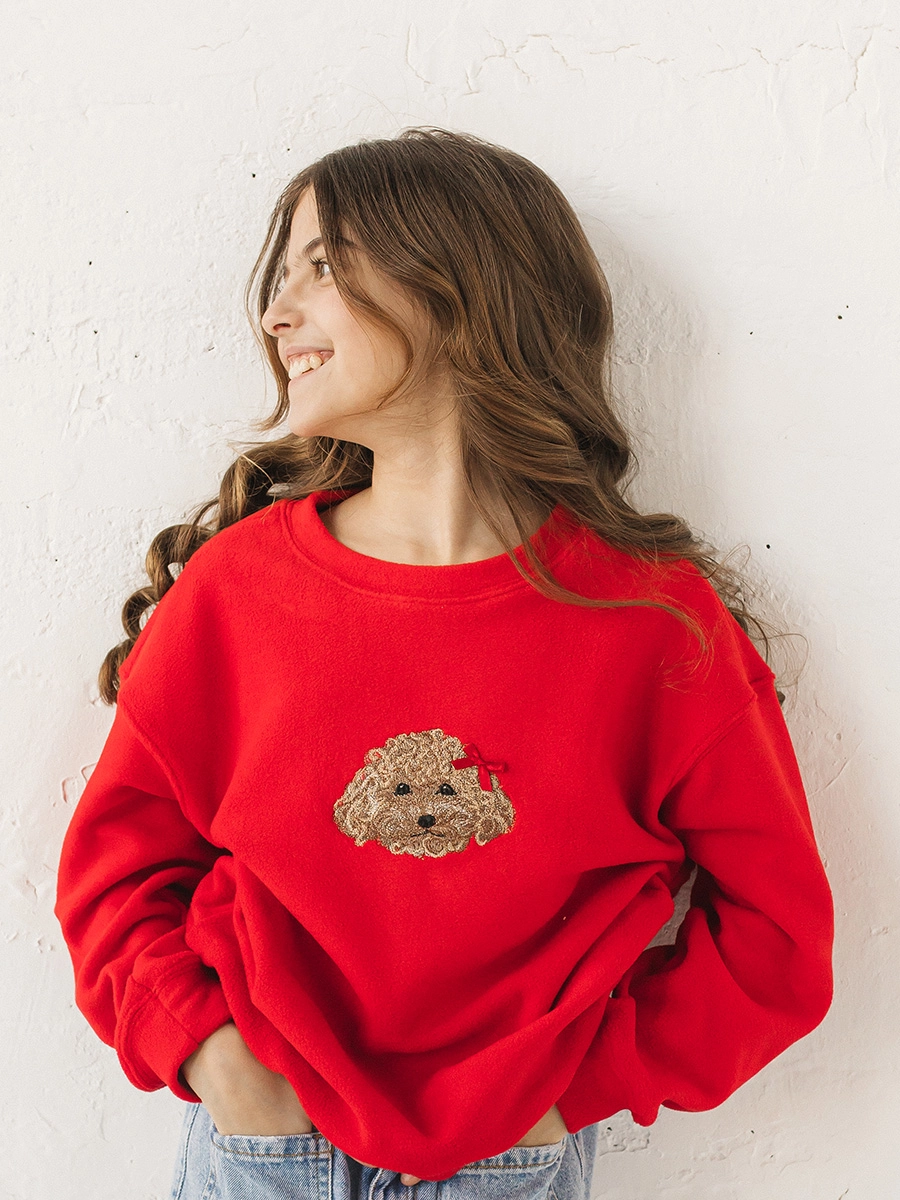 Яркий красный свитшот мгновенно поднимает настроение и делает образ выразительным, а милый щенок-вышивка добавляет нежный характер. Модель подходит для активных будней, когда важны тепло, мягкость и свобода движения.