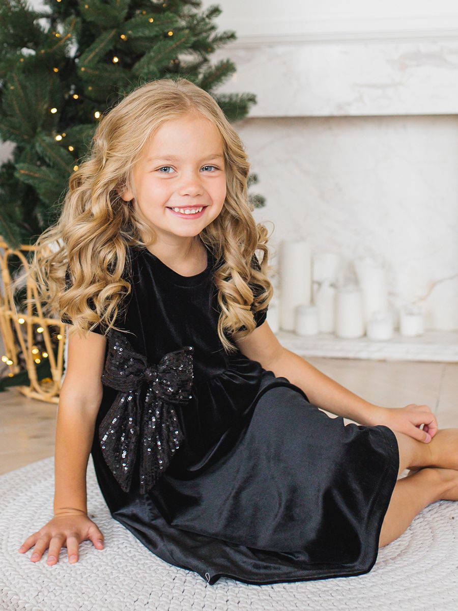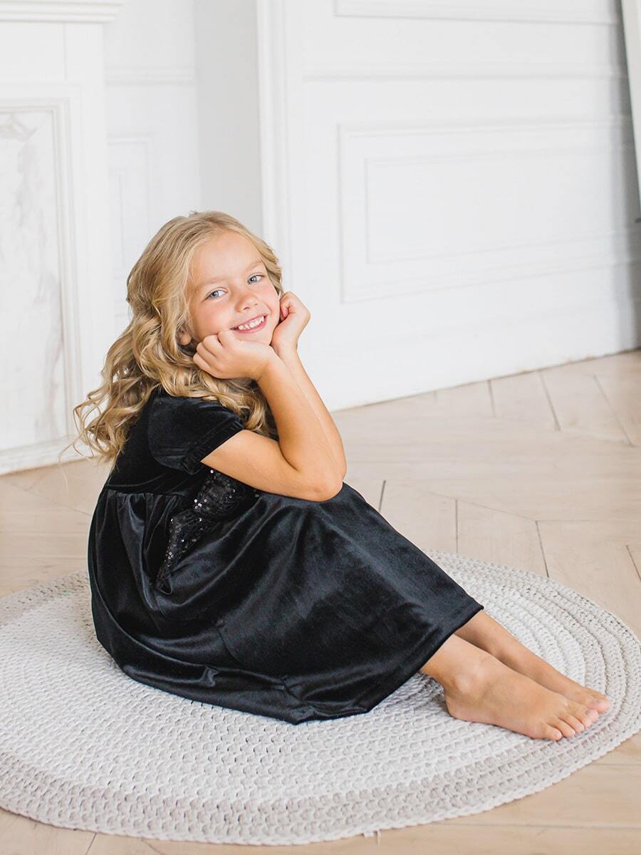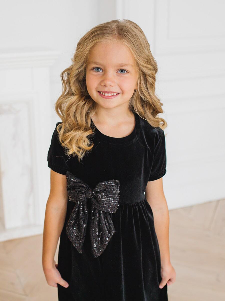 Праздничное платье для девочки Black Velvet & Dark Dimond Bow - это выбор для особого случая. Изделие произведено в России из качественного бархата, состоящего на 90% из полиэстера и 10% эластана, оно обеспечивает комфортную посадку и приятное ощущение на коже. Однотонный черный цвет создает элегантность, а короткий рукав добавляет нежности образу. Основной деталью является яркий люриксовый бант. Плотная ткань держит форму, сохраняет внешний вид после стирки. Подходит девочкам возрастом от 3 до 13 лет.