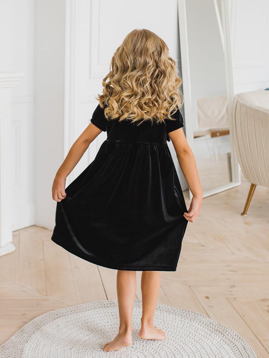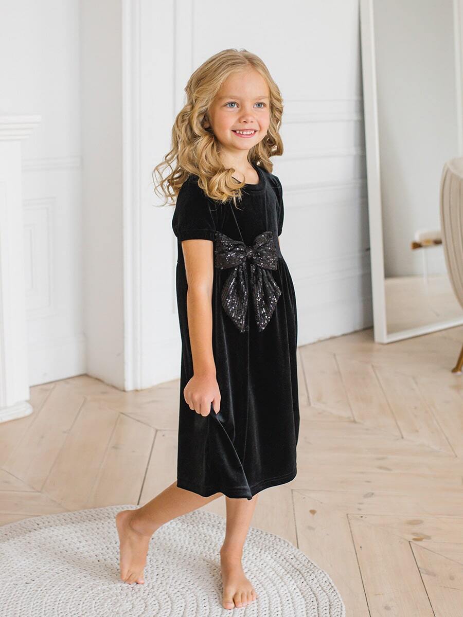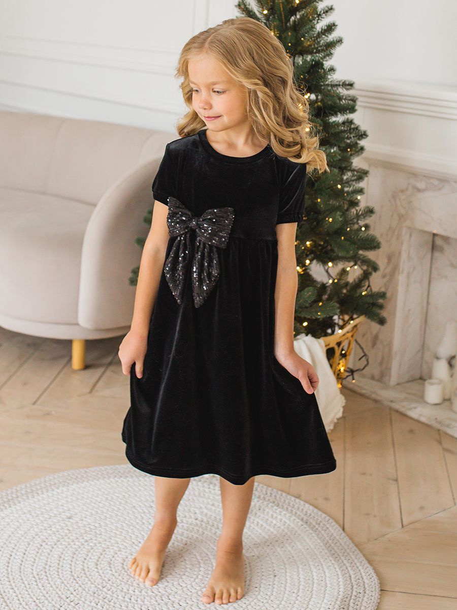 Праздничное платье для девочки Black Velvet & Dark Dimond Bow - это выбор для особого случая. Изделие произведено в России из качественного бархата, состоящего на 90% из полиэстера и 10% эластана, оно обеспечивает комфортную посадку и приятное ощущение на коже. Однотонный черный цвет создает элегантность, а короткий рукав добавляет нежности образу. Основной деталью является яркий люриксовый бант. Плотная ткань держит форму, сохраняет внешний вид после стирки. Подходит девочкам возрастом от 3 до 13 лет.