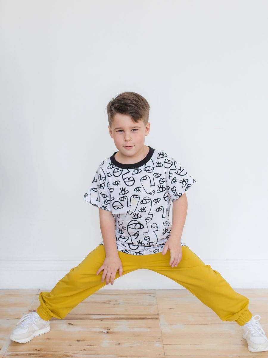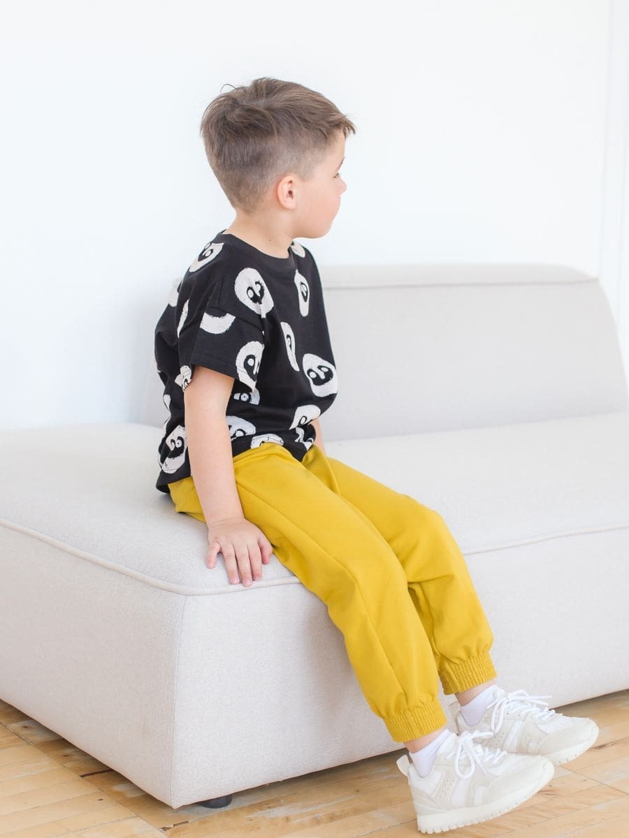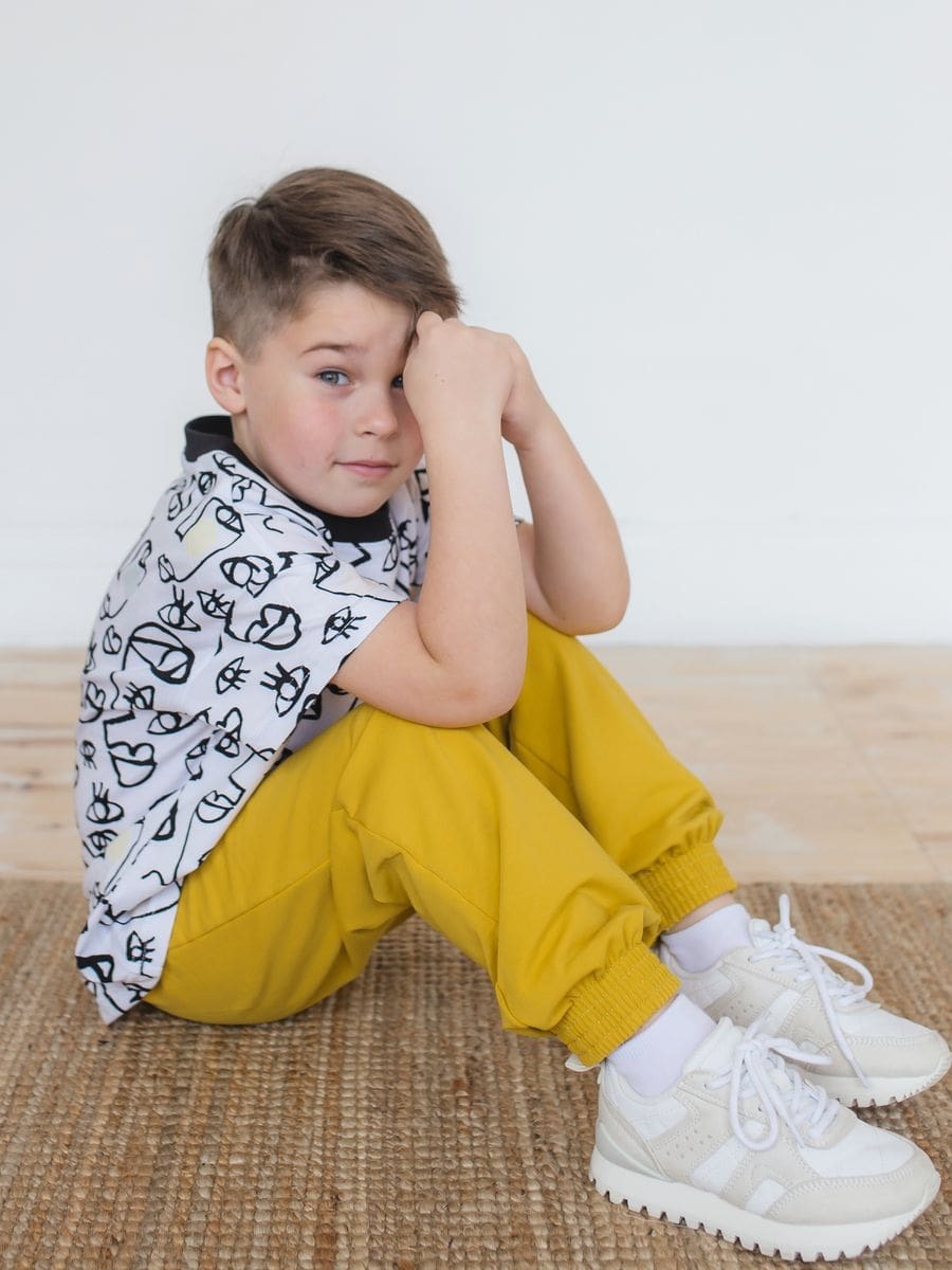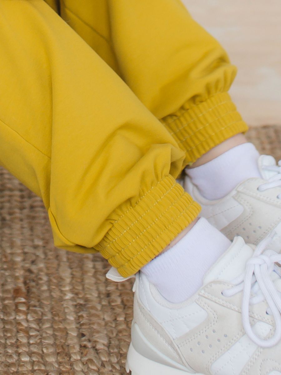 Брюки от Радужного Хлопка - для мальчиков от 2 до 12 лет! Изготовлены из качественного футера с добавлением лайкры, обеспечивая комфорт и свободу движений. Однотонный горчичный цвет подойдет на любой сезон. Произведены в России, плотностью 260гр.