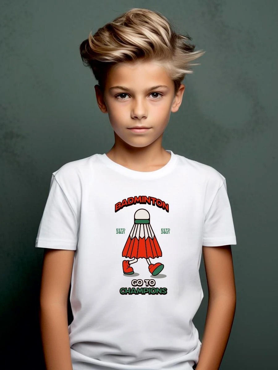 Ищете, где купить футболку для мальчика для школы, прогулок и активного отдыха? Модель Go to Champions — это удобная хлопковая футболка с ярким принтом волана для бадминтона и мотивирующей надписью, которая подойдёт юным спортсменам и любителям динамичных игр.