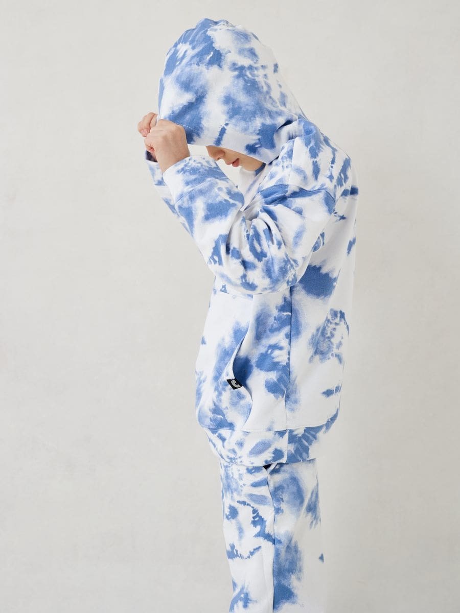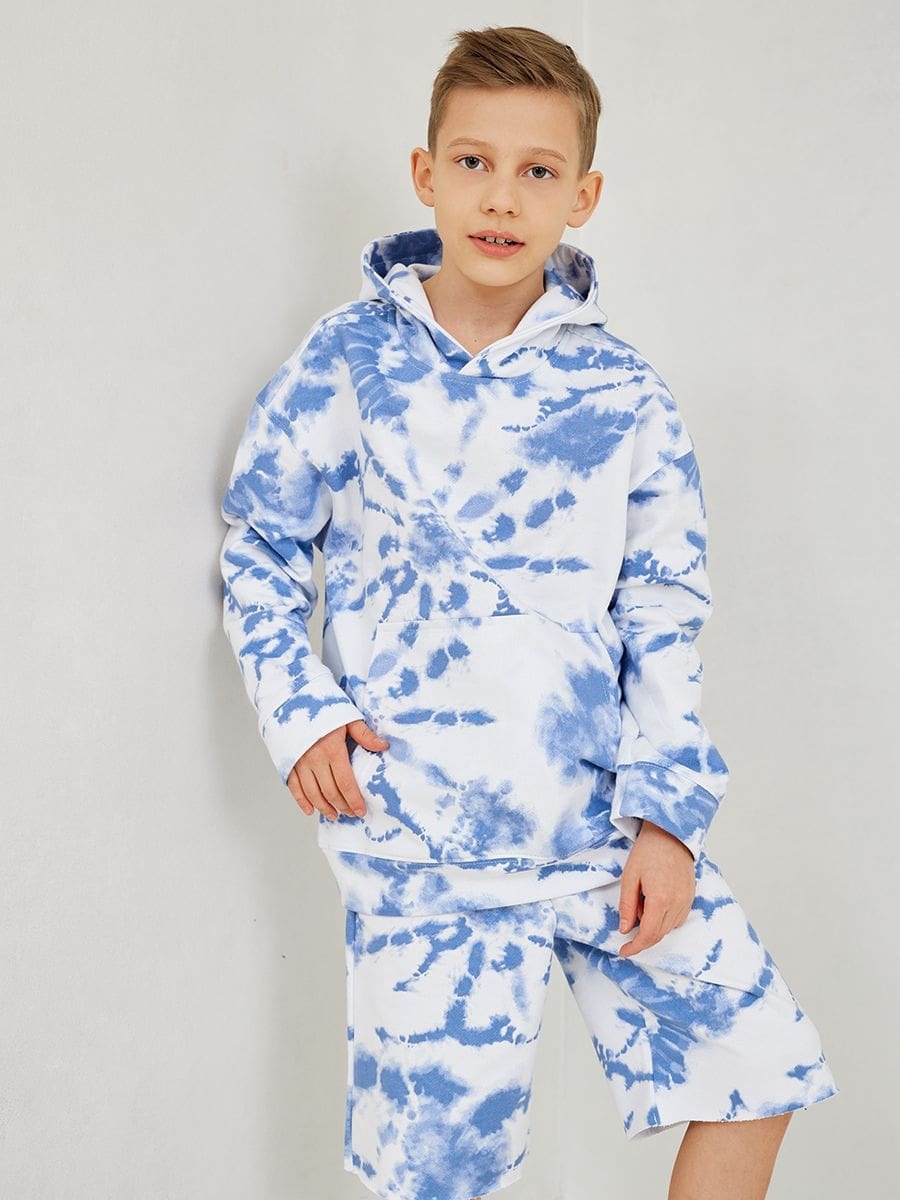 Худи в цвете небесный тай-тай в стиле оверсайз с накладным карманом-кунгуру выполнен из футера (100% хлопок). Это стильный и комфортный выбор для повседневной носки. Худи имеет удобную посадку и свободный крой, что позволяет носить его как мальчикам, так и девочкам. Подходит на рост от 98 см до 152 см. Можно дополнить образ шортами и джоггерами в цвете небесный тай-дай из коллекции Радужного Хлопка