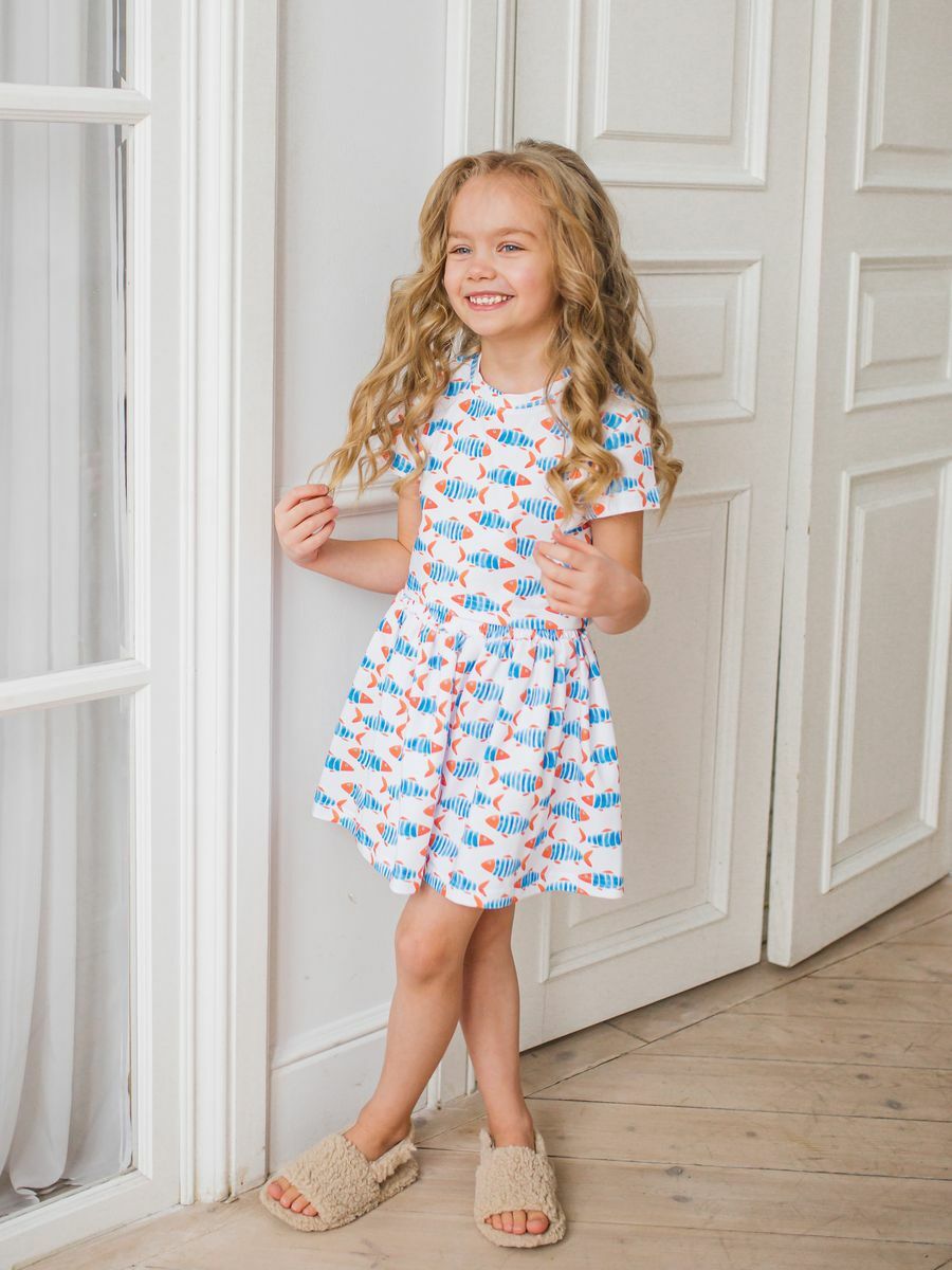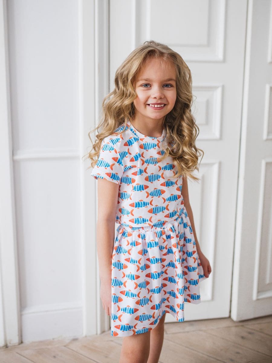 Футболка Blue Fish для девочки от изготовлена из кулира с добавлением лайкры, что обеспечивает комфорт и свободу движений. Оригинальный узор в виде рыбок придает стильный вид. Подходит для детей от 3 до 9 лет, рост 98 - 134 см. на любой сезон. Высокое качество материалов гарантирует долгий срок службы.