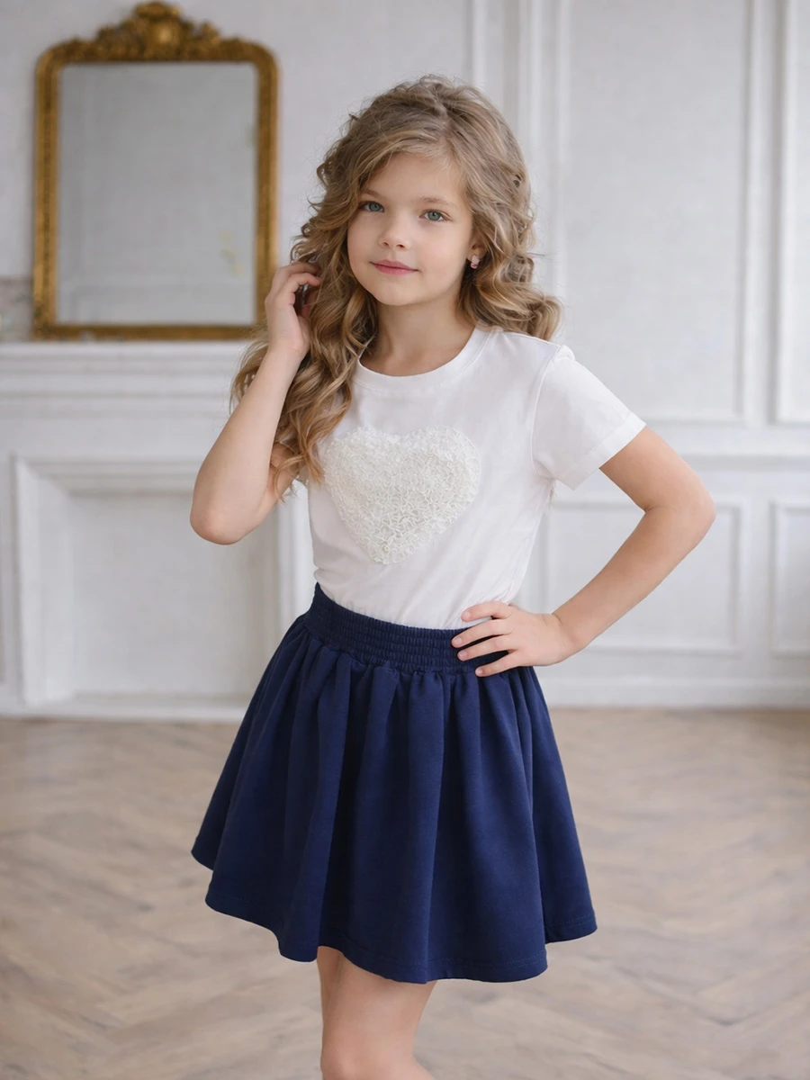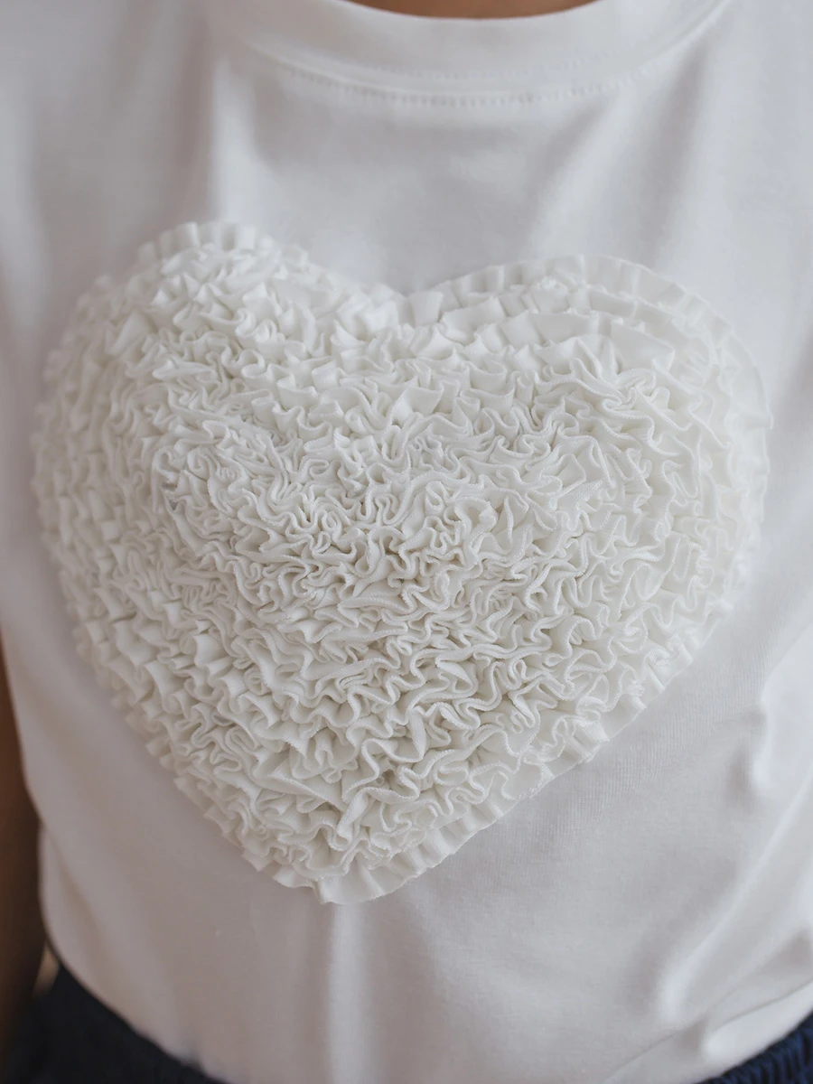 White Soul Spark — это базовая белая футболка для девочки, которая выглядит особенно благодаря крупной вышивке в виде сердца. Модель отлично подходит для школы, прогулок и повседневных образов: легко сочетается с юбками, шортами, джинсами и спортивными брюками.