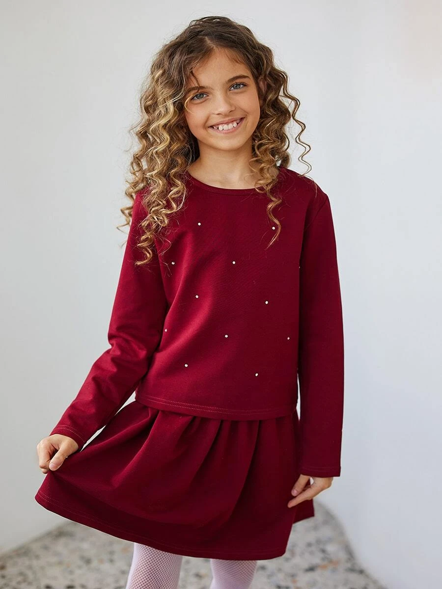 Этот бордовый школьный джемпер со стразами для девочки часто выбирают мамы, ценящие долговечность. Удобная кофта не сковывает движений и идеально подходит для демисезона.