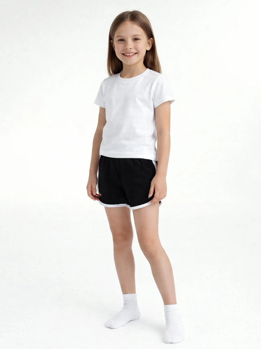 Черные шорты с белыми лампасами и чистая белая футболка создают модный спортивный образ, который нравится современным девочкам.