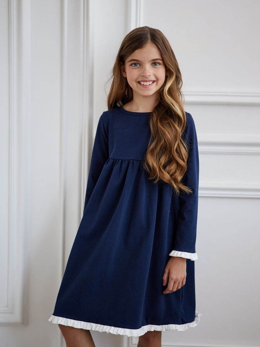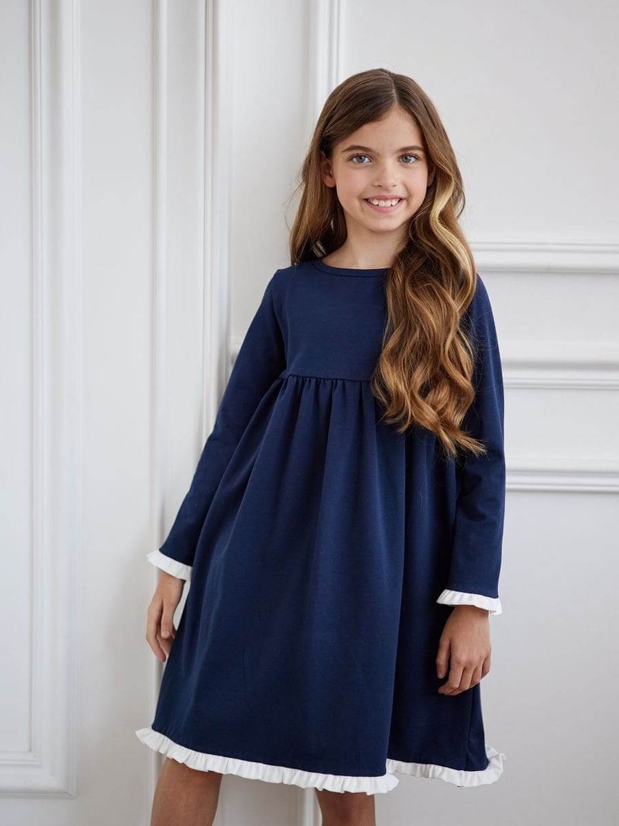 Модель выполнена из мягкого, дышащего материала, который подходит для чувствительной кожи и обеспечивает комфорт для активных школьных будней. Классический прямой крой, округлый воротник и изящные белые оборки придают образу утонченность и лёгкую романтичность.