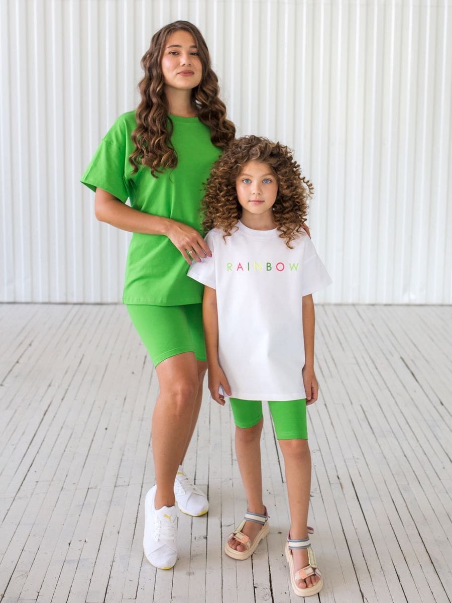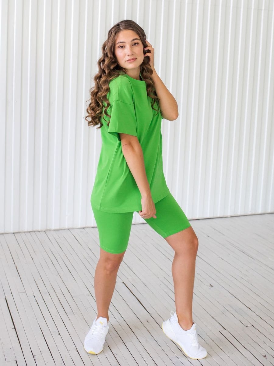 Ярко-зеленый комплект из футболки и велосипедок – отличная альтернатива спортивному костюму в теплое время года. Модель идеальна для занятий фитнесом, бега, прогулок и отдыха. Сочный зеленый цвет поднимает настроение и привлекает взгляды. Натуральность ткани – залог вашего комфорта и долговечности использования.