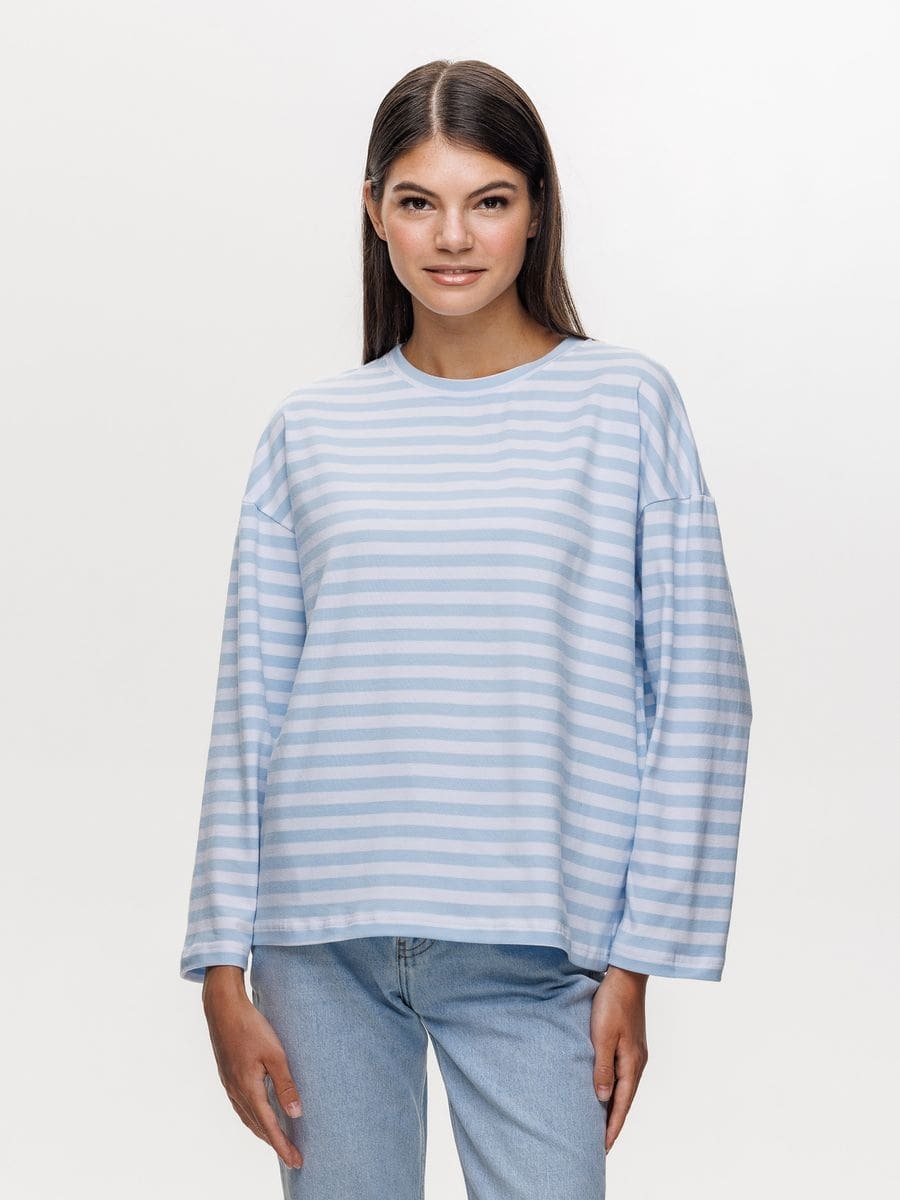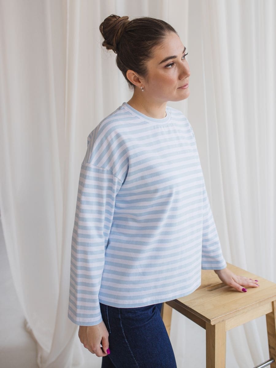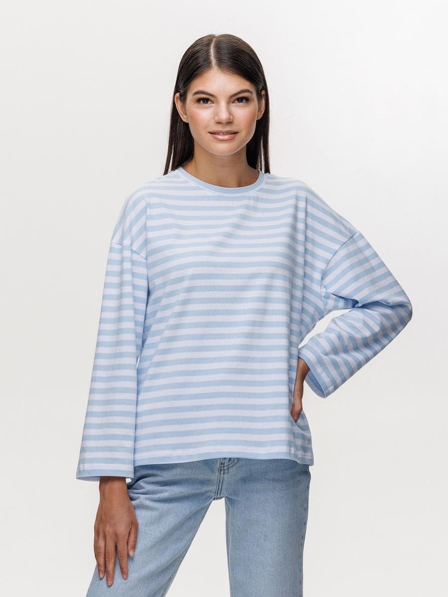 Лонгслив оверсайз в модную бело голубую полоску напомнит вам об отпуске и подарит мягкость и комфорт. Свободный прямой покрой подойдет на любую фигуру. За лонгсливом легко ухаживать, ткань не боится стирок и не теряет первоначальный вид. Смело комбинируйте модель с другими элементами вашего гардероба, в том числе с брюками и юбками.