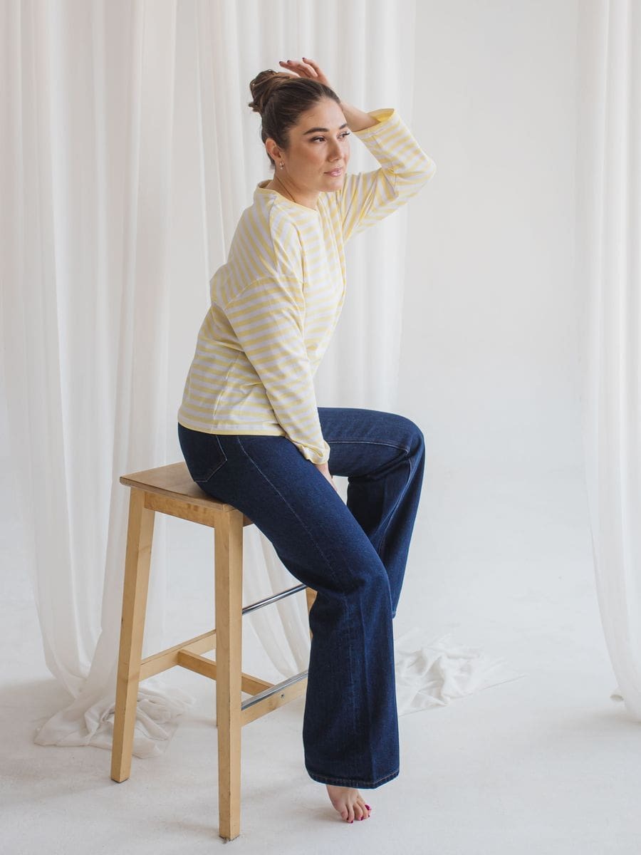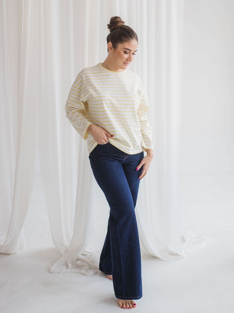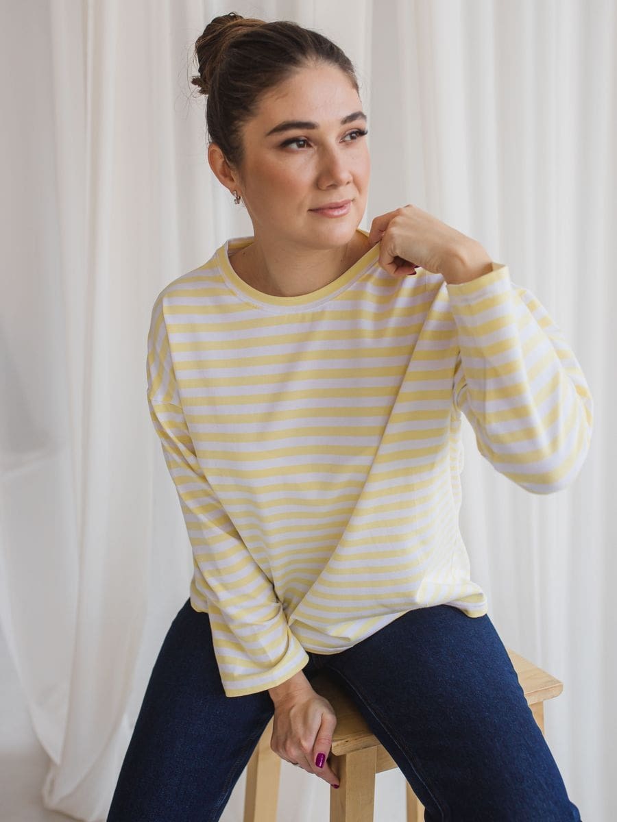Лонгслив с круглым вырезом в бело желтую полоску оценят любительницы комфортных вещей и нежных оттенков. Пастельные тона модели прекрасно сочетаются с другими элементами вашего образа. Свободный прямой покрой подарит комфорт и удобство. Отличная базовая вещь на каждый день. Смело сочетайте модель с джинсами, шортами и юбками.