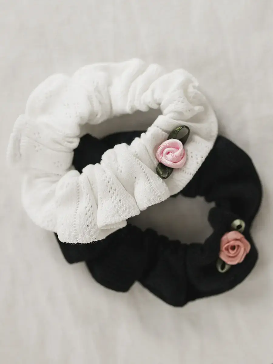 Набор Day & Night Garden резинки для волос можно купить в интернет магазине "Радужный Хлопок". Стильная чёрная резинка для вечерних укладок и нежная белая для дневных образов. Каждая украшена атласной розочкой ручной работы.