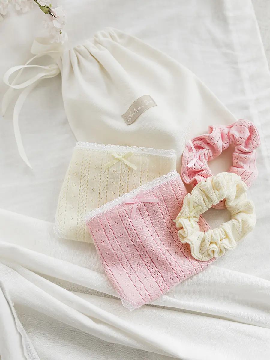 Идеальный подарок для стильных женщин: двое комфортных стрингов из 100% хлопка с ажурной рибаной в лимонном и розовом цветах. В комплекте – подарочный холщовый мешочек и две яркие резинки для волос (желтая и розовая).