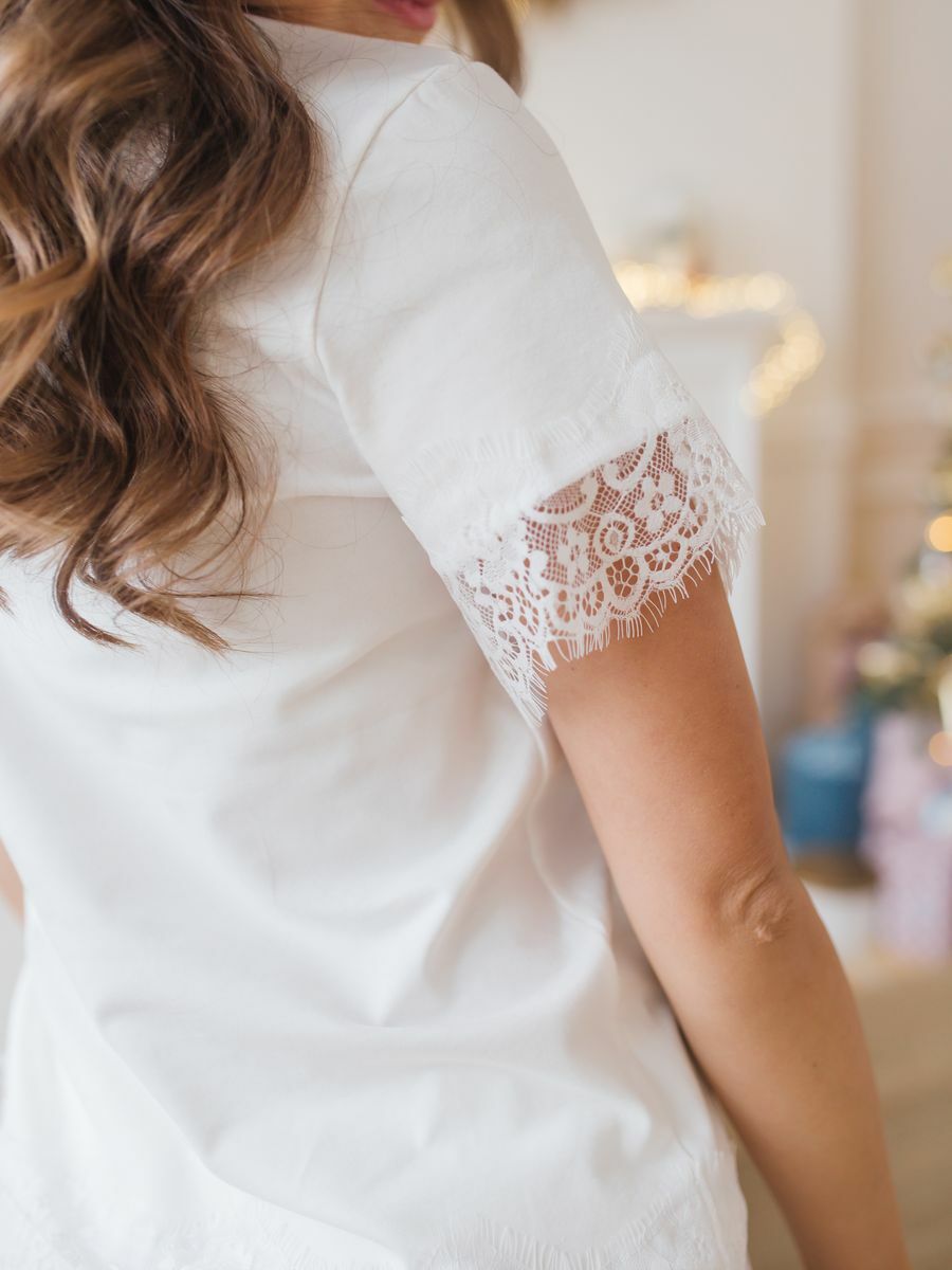 Комплект цвета молока из футболки и шорт, выполненный в классическом стиле и украшенный кружевами, подчеркнет отличный вкус его обладательницы. Данная модель выполнена из хлопковой ткани премиум качества, что является залогом натуральности и долговечности изделия. Комплект прекрасно подходит для дома. Размеры XS - 42, S - 44, М - 46, L - 48, XL - 50 - 52.